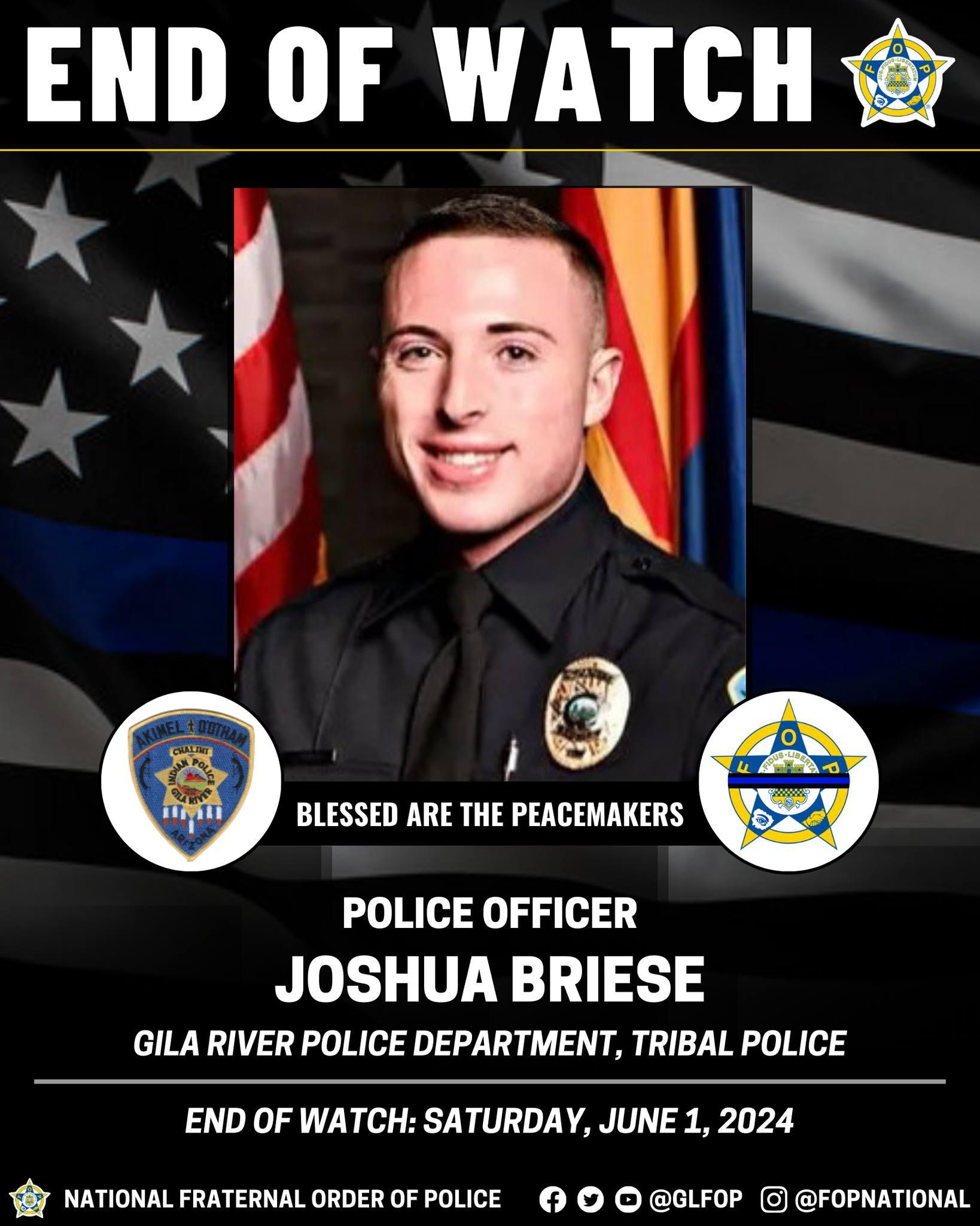Police Officer Briese had served with the Gila River Police Department for less than 1 year and was still completing field training. When Officer Briese and his training partner arrived on the scene, they were met with gun fire. Officer Briese's father, Deputy Sheriff David Leroy Briese, Jr. of Yellowstone County Sheriff's Office, Montana, died in the line of duty on November 3, 2006. Thank you for your service & RIP.